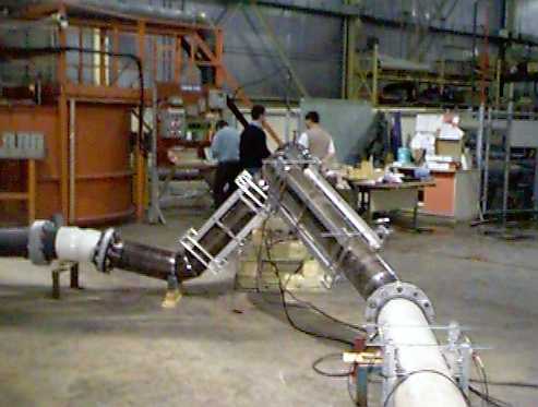 A piping configuration to be calibrated is set up and measurements are taken with the meter to be calibrated and compared to the reference flow. An example of an out-of-plane elbow piping configuration testing setup is depicted below.