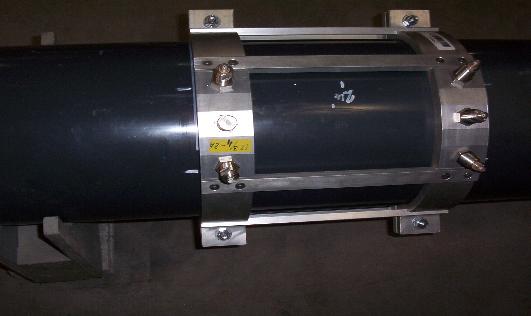 An alternative frame design with multiple transducer blocks aligned at different angles demonstrated in an application in Budapest, Hungary. The lower block has transmit transducers installed and hidden behind the pipe at 180 degrees are the corresponding receiver transducers. The upper transducer block is not populated with any transducers. Cables are then connected to the transducer BNC.